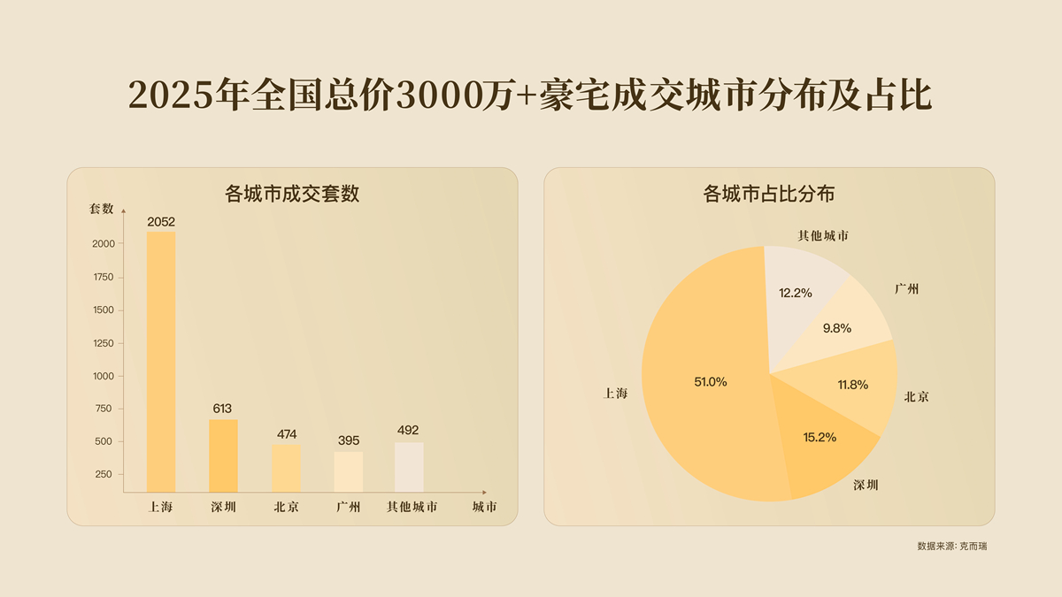 根据克而瑞数据显示,2025年全国总价3000万以上的顶豪成交中,北上广深四大一线城市占比高达87.8%,长期垄断着国内顶级豪宅市场的绝对份额,新一线城市及其他城市的份额仅为12.2%。